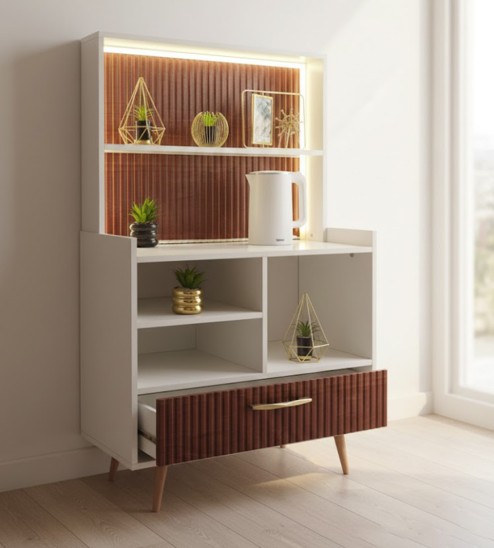 كوفي كورنر خشبي أنيق بمقاس مثالي يحتوي على رفوف علوية وأسطح عملية لتحضير القهوة، مع 6 أدراج تخزين مرتبة. خامات MDF متينة وإضاءة مدمجة تضيف لمسة فخامة، وتصميم مناسب للمنازل والمكاتب.
