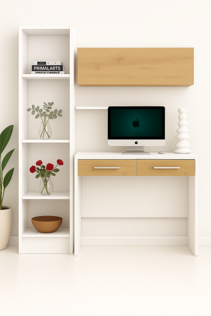 يتميز المكتب بتصميم نظيف يجمع بين اللون الأبيض والخشب الطبيعي، ما يجعله مثاليًا لغرف النوم، المكاتب المنزلية، أو مساحات العمل العصرية.