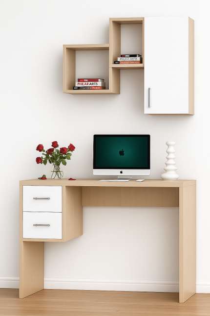 أضف لمسة أنيقة وعملية لمساحة عملك مع هذا المكتب العصري المصمم بشكل ذكي. يجمع بين سطح أبيض أنيق مع رفوف جانبية متعددة الاستخدامات بلون الخشب الطبيعي، ما يجعله مثالياً للعمل أو الدراسة أو حتى كقطعة ديكور عملية في المنزل.