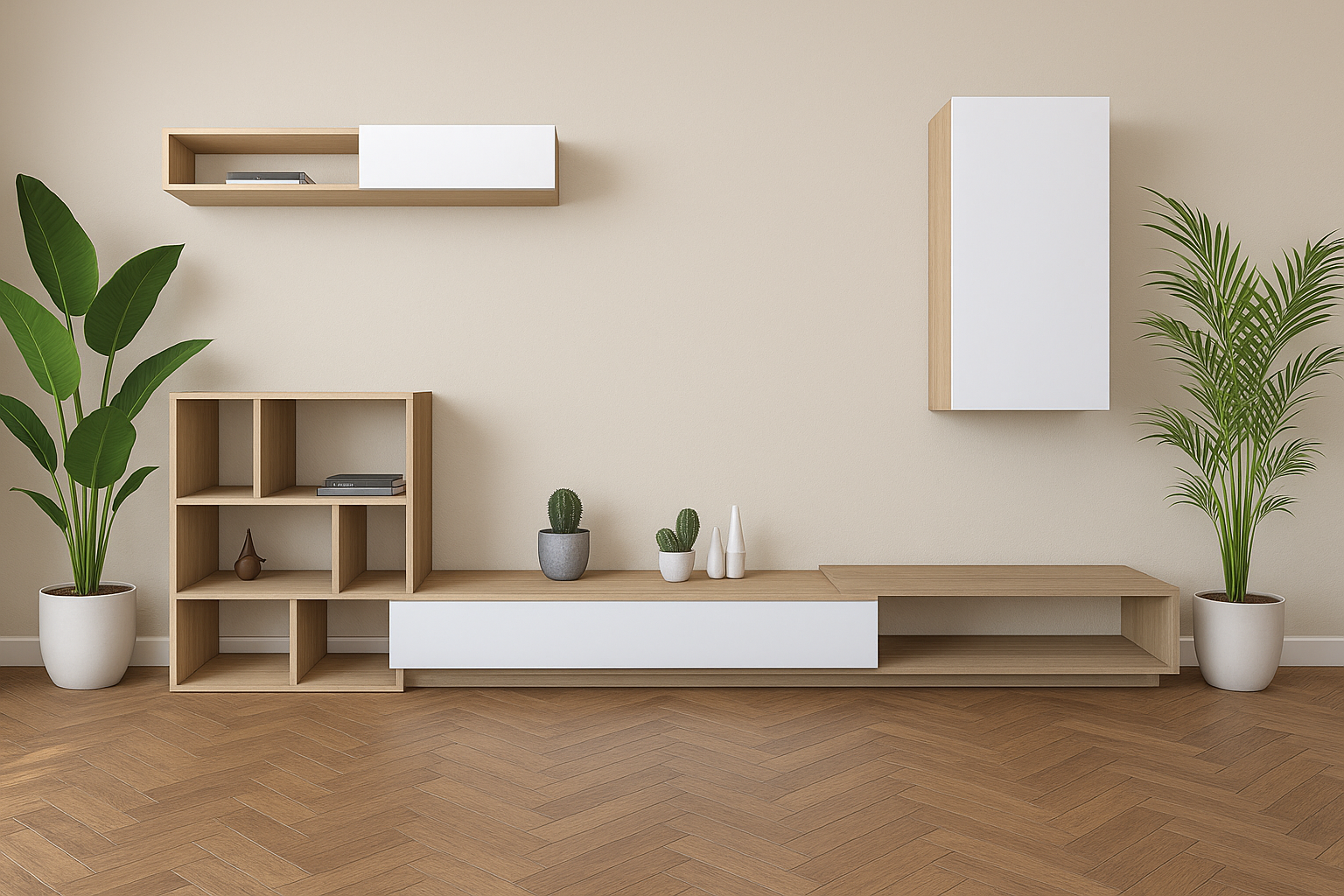 ترابيزة تلفزيون عصرية تجمع بين الخشب الطبيعي والأبيض مع أرفف وخزائن عملية لتخزين منظم ولمسة ديكورية أنيقة.