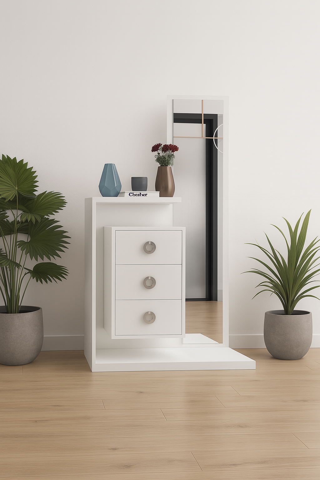 كونسول أبيض بـ3 أدراج ومرآة طولية