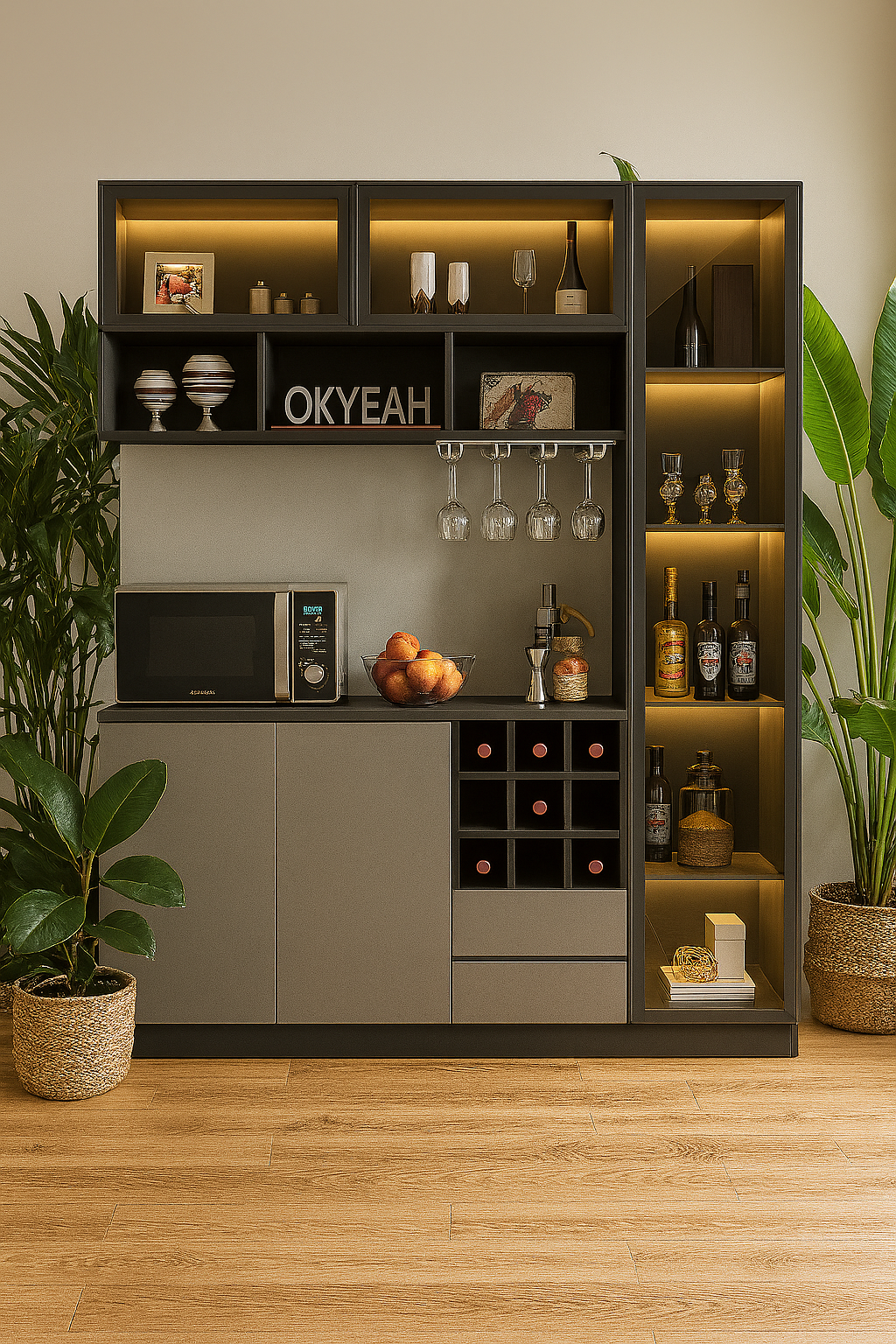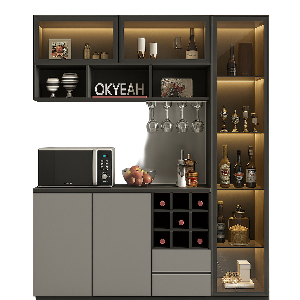 Bar and beverage storage section: Illuminated shelves for displaying bottles and glasses, with a hanging glass holder.